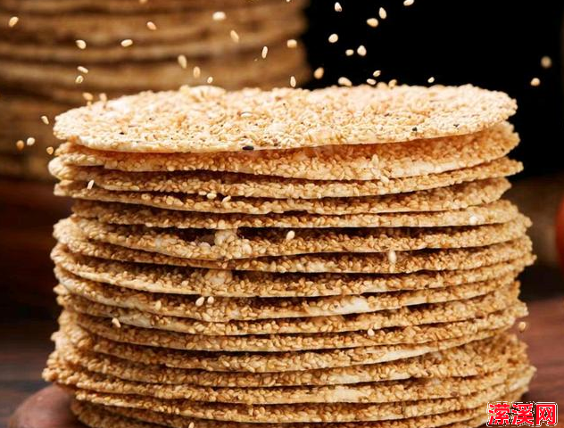 周村烧饼外形圆而色黄,正面贴满芝麻仁,背面酥孔罗列,”焦”、”薄”、”香”、”酥‘’。