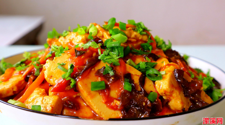 配料:豆腐,牛肉碎,姜末,蒜末,陴县豆瓣酱,酱油,糖,鸡粉,花椒,辣椒,花椒粉
