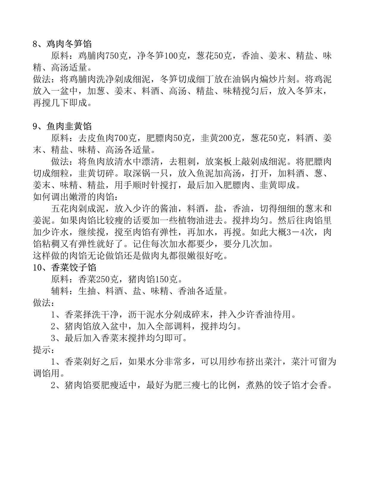 八种饺子馅的做法,涵盖各种口味,让你爱不释口 1 白菜猪肉馅 食材猪肉200克,白菜200克,小葱2根,香菜2根,姜3片,盐1勺,生抽15毫升,麻油15毫升 步骤猪肉剁成肉末,白菜切碎,小葱生姜和香菜切碎将麻油盐和生抽放入猪肉末中搅拌,再加入白菜碎,搅拌均匀2 茴香猪肉馅。