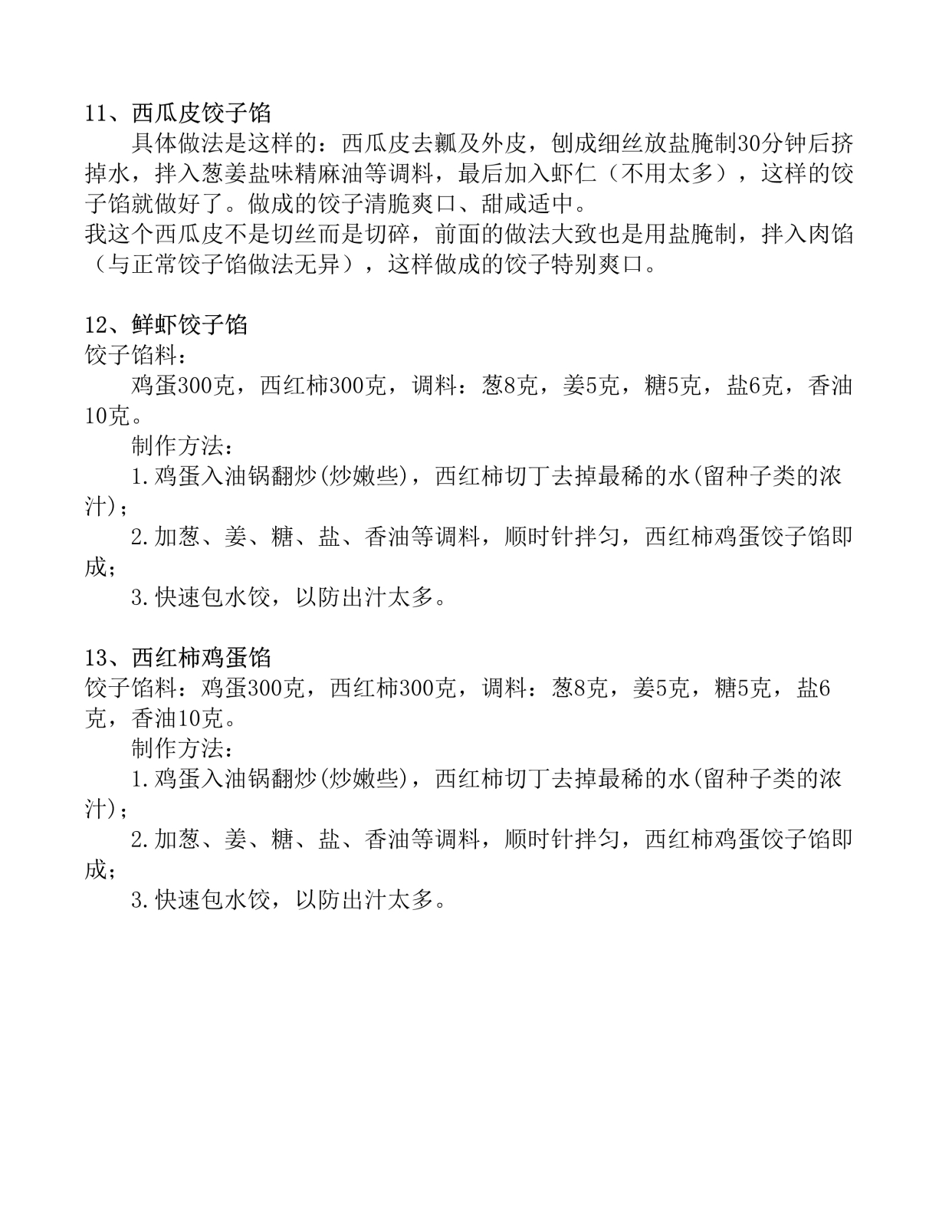我这个西瓜皮不是切丝而是切碎,前面的做法大致也是用盐腌制,拌入肉馅与正常饺子馅做法无异,这样做成的饺子特别爽口五茴香饺子馅 材料冷水面团1份约2杯面粉量 茴香1把猪肉馅375克 调味料 酒1大匙酱油2大匙盐小半茶匙清水2大匙麻油4大匙 做法1面团分小块,擀成;饺子馅的做法1 准备好饺子馅需要的食材,如猪肉韭菜香菇等2 将食材洗净,切成小块,放入碗中3 加入适量的盐鸡精料酒生抽姜末葱花等调料,搅拌均匀4 按照自己喜欢的口味加入适量的辣椒油花椒粉等调料5 搅拌均匀后,放入冰箱冷藏一段时间,让馅料更加入味6 饺子馅;素饺子是一道受到广大素食者喜爱的传统中国美食,它的馅料种类丰富多样,口感鲜美,营养丰富下面是一些素饺子馅的做法1 韭菜馅将新鲜韭菜洗净,切成细碎加入蒜末生姜末盐胡椒粉鸡精和适量的植物油搅拌均匀后,即可作为饺子馅使用2 香菇馅将香菇洗净,切成细末加入切碎的葱。