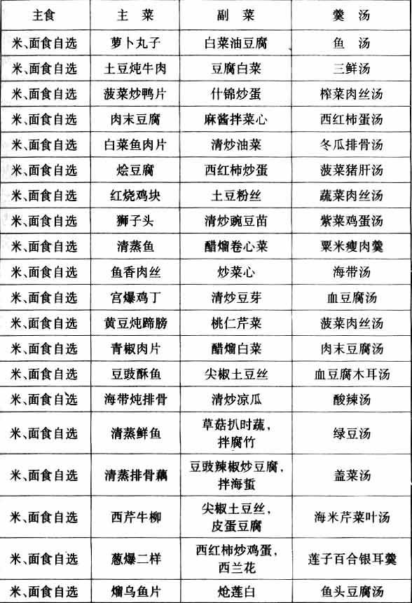 自己各自选一样吧,最好做到营养均衡,换着吃第四餐加餐15点左右,食物如下碳水化合物一片面包或一个玉米棒或一个馒头 蛋白质一个蛋清牛奶酸奶蔬菜水果一个香蕉或橘子 玉米棒由于上班可能没条件吃,可以换面包 自己各自选一样吧,最好做到营养均衡,换着吃第五餐正餐。