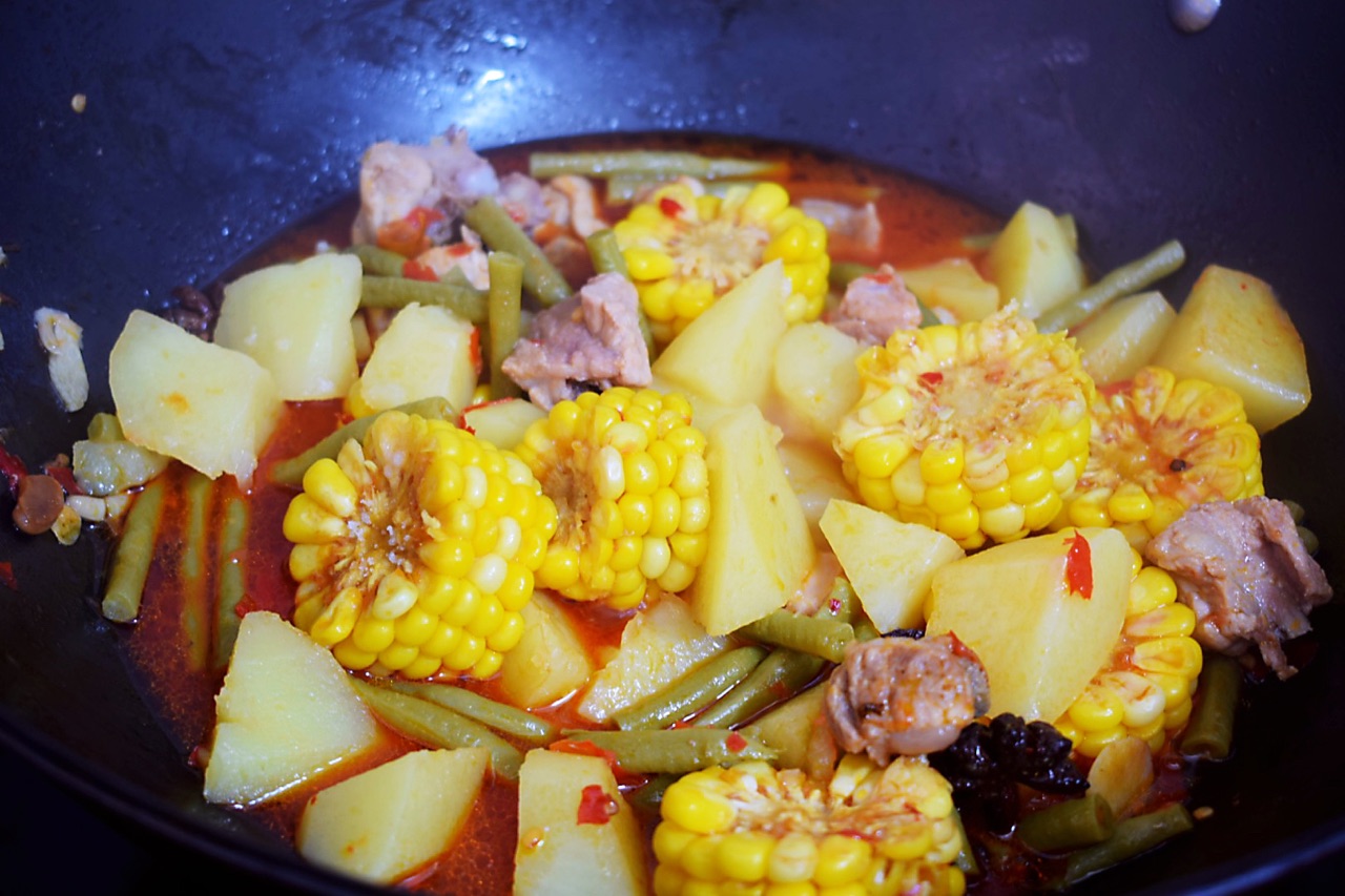 1准备食材玉米一根,土豆一个,四季豆100克,适量豆瓣生抽大蒜葱2四季豆切段,土豆去皮切块,葱切段,蒜切片,玉米切段3热锅下油,倒入葱蒜,加入豆瓣酱炒香4倒入土豆四季豆玉米,调入生抽,大火翻炒均匀注入清水没过食材,加盖焖煮15分钟即可。