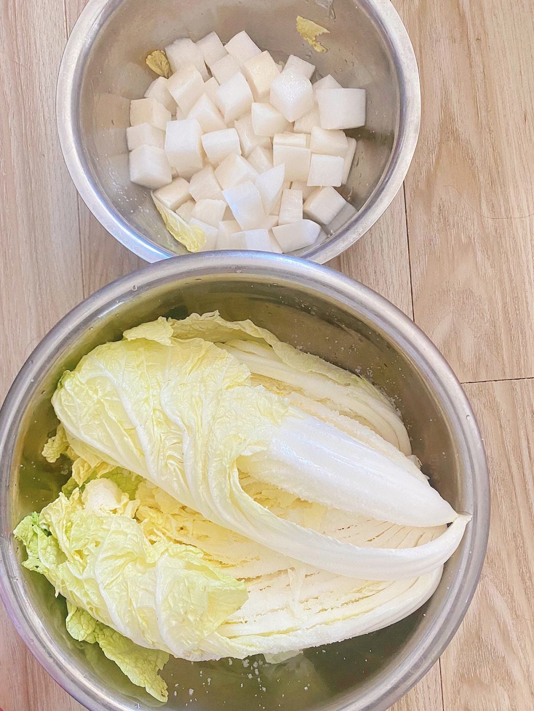 2、把洋葱姜蒜,苹果梨切好,放入搅拌机搅成果泥6把葱切成葱花,白萝卜萝卜丝切丝备用7把辣椒面糯米糊,胡萝卜丝,白萝卜丝,葱花,韭菜,鱼露果泥,虾酱和香菜和到一起搅匀备用8把白菜的每一面都抹上辣白菜酱,放入玻璃罐中,常温下放置1~2天发酵,冰箱冷藏2~3天就可以食用了;1将买回的泡菜坛洗净晾干,注意不要沾到油和生水将食材洗净晾干将食材切成适当的大小,不要太小,这样不好捞出2将所有食材放入坛中加入食盐白酒凉白开加入白酒适量3坛口加水密封泡菜坛,等上20天就可以吃了还有就是喜欢酸点的话就少放些盐,腌制的时间稍长些喜欢咸的;11颗白菜适量蒜适量盐适量葱半个梨适量白糖50g糯米粉适量辣椒粉300g水在白菜头的部分先切三厘米深十字刀,然后把白菜撕成两半,这样可以使心里面的叶子保持完整2腌制大白菜,从最外一层开始撒盐,根多撒,叶子少撒把撒完盐的白菜放入一个无油的盆里,压实3腌制6。