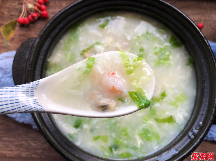再次烧开以后,然后倒入花蛤、虾仁,撒入适量的食盐,等到虾仁花蛤变熟,淋入鸡蛋液,搅匀烧开就可以盛出食用了。